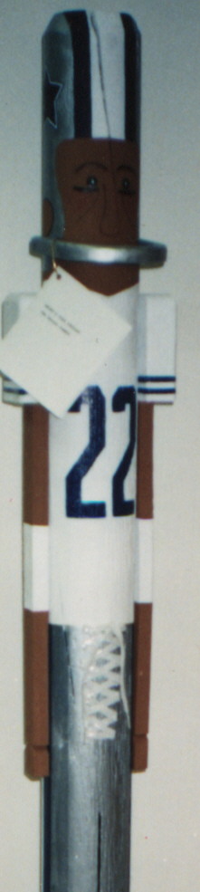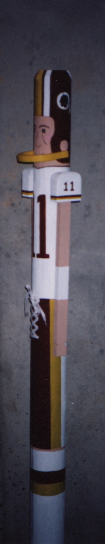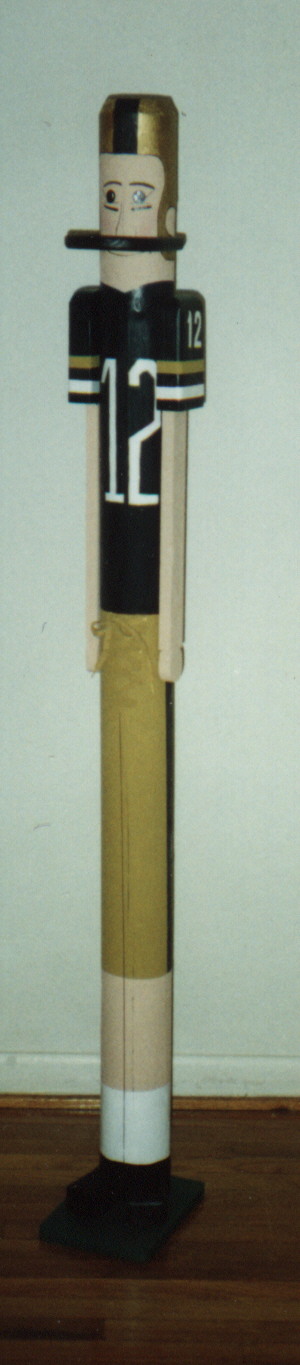 Support your favorite football team or player with a customized football Pole Person! Note the use of facemasks, string ties for the pants and shoe laces (added since the Army Football player photo), bulky shoulder pads and personalization of team uniforms (home or away) and player number.